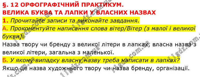 §. 12 ОРФОГРАФІЧНИЙ ПРАКТИКУМ. ВЕЛИКА БУКВА ТА ЛАПКИ У ВЛАСНИХ НАЗВАХ 1. Прочитайте записи та виконайте завдання. А. Прокоментуйте написання слова вітер/Вітер (з малої і великої букви). Назва твору чи бренду з великої літери в лапках, власна назва з великої літери, загальна з маленької. Б. У якому випадку власну назву треба написати в лапках? Якщо це назва художнього твору чи назва бренду, організації.