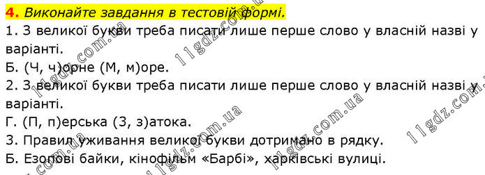 Виконайте завдання в тестовій формі. 1. З великої букви треба писати лише перше слово у власній назві у варіанті. Б. (Ч, ч)орне (М, м)оре. 2. З великої букви треба писати лише перше слово у власній назві у варіанті. Г. (П, п)ерська (3, з)атока. 3. Правил уживання великої букви дотримано в рядку. Б. Езопові байки, кінофільм «Барбі», харківські вулиці.