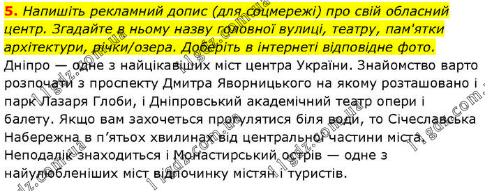 Напишіть рекламний допис (для соцмережі) про свій обласний центр. Згадайте в ньому назву головної вулиці, театру, пам'ятки архітектури, річки/озера. Доберіть в інтернеті відповідне фото. Дніпро — одне з найцікавіших міст центра України. Знайомство варто розпочати з проспекту Дмитра Яворницького на якому розташовано і парк Лазаря Глоби, і Дніпровський академічний театр опери і балету. Якщо вам захочеться прогулятися біля води, то Січеславська Набережна в п’ятьох хвилинах від центральної частини міста. Неподалік знаходиться і Монастирський острів — одне з найулюбленіших міст відпочинку містян і туристів.