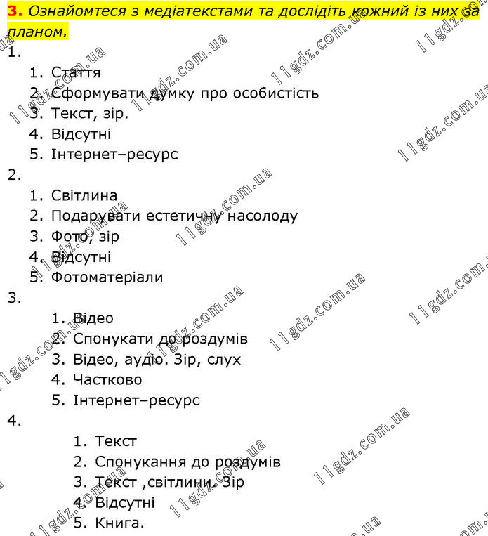 Ознайомтеся з медіатекстами та дослідіть кожний із них за планом. 1. 1. Стаття 2. Сформувати думку про особистість 3. Текст, зір. 4. Відсутні 5. Інтернет–ресурс 2. 1. Світлина 2. Подарувати естетичну насолоду 3. Фото, зір 4. Відсутні 5. Фотоматеріали 3. 1. Відео 2. Спонукати до роздумів 3. Відео, аудіо. Зір, слух 4. Частково 5. Інтернет–ресурс 4. 1. Текст 2. Спонукання до роздумів 3. Текст ,світлини. Зір 4. Відсутні 5. Книга.
