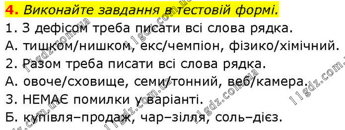 Виконайте завдання в тестовій формі. 1. З дефісом треба писати всі слова рядка. А. тишком/нишком, екс/чемпіон, фізико/хімічний. 2. Разом треба писати всі слова рядка. А. овоче/сховище, семи/тонний, веб/камера. 3. НЕМАЄ помилки у варіанті. Б. купівля–продаж, чар–зілля, соль–дієз.
