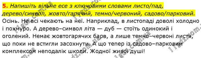 Напишіть вільне есе з ключовими словами листо/пад, дерево/символ, жовто/гарячий, темно/червоний, садово/парковий. Осінь. Не всі чекають на неї. Наприклад, в листопаді доволі холодно і похмуро. А дерево–символ літа — дуб — стоїть одинокий і оголений. Немає жовтогарячих барв, а лише темно–червоні листя, що поки не встигли засохнути. А що тепер із садово–парковим комплексом неподалік школи. Жодної живої душі!