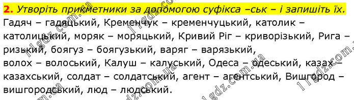 Утворіть прикметники за допомогою суфікса –ськ – і запишіть їх. Гадяч – гадяцький, Кременчук – кременчуцький, католик – католицький, моряк – моряцький, Кривий Ріг – криворізький, Рига – ризький, боягуз – боягузький, варяг – варязький, волох – волоський, Калуш – калуський, Одеса – одеський, казах – казахський, солдат – солдатський, агент – агентський, Вишгород – вишгородський, люд – людський.