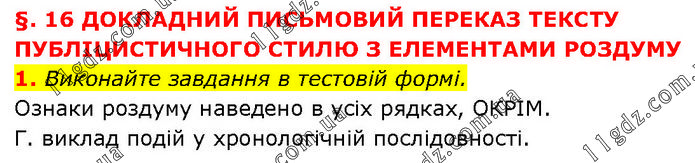§. 16 ДОКЛАДНИЙ ПИСЬМОВИЙ ПЕРЕКАЗ ТЕКСТУ ПУБЛІЦИСТИЧНОГО СТИЛЮ З ЕЛЕМЕНТАМИ РОЗДУМУ 1. Виконайте завдання в тестовій формі. Ознаки роздуму наведено в усіх рядках, ОКРІМ. Г. виклад подій у хронологічній послідовності.