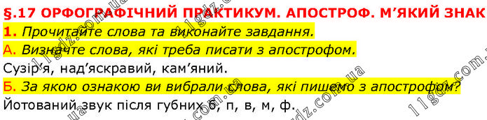§.17 ОРФОГРАФІЧНИЙ ПРАКТИКУМ. АПОСТРОФ. М’ЯКИЙ ЗНАК 1. Прочитайте слова та виконайте завдання. А. Визначте слова, які треба писати з апострофом. Сузір’я, над’яскравий, кам’яний. Б. За якою ознакою ви вибрали слова, які пишемо з апострофом? Йотований звук після губних б, п, в, м, ф.
