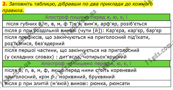 Заповніть таблицю, дібравши по два приклади до кожного правила. Апостроф пишемо перед я, ю, є, ї після губних б, п, в, м, ф Тім'я, вим'я, арф'яр, розіб'ється після р при роздільній вимові (чути [й]): Кар'єра, кар'єр, бар'єр після префіксів, що закінчуються на приголосний під'їхати, роз'їхатися, без'ядерний після першої частини, що закінчується на приголосний (у складних словах) : дит'ясла, чотирьох'ярусний Апостроф не пишемо перед я, ю, є, ї після б, п, в, м, ф, якщо перед ними стоїть кореневий приголосний, крім р : морквяний, бруквяний після р при злитій (м’якій) вимові: рюмка, рюмсати