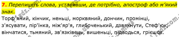 Перепишіть слова, уставивши, де потрібно, апостроф або м’який знак. Торф'яний, кінчик, неньці, морквяний, дончин, промінці, з'ясувати, пір'їнка, між'яр'я, глибоченький, дзвякнути, Стеф'юк, вінчатися, тьмяний, зв'язківець, вишеньці, підводься, грієшся.