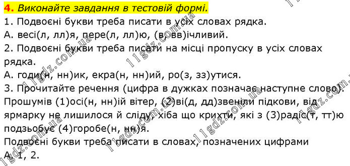 Виконайте завдання в тестовій формі. 1. Подвоєні букви треба писати в усіх словах рядка. А. весі(л, лл)я, пере(л, лл)ю, (в, вв)ічливий. 2. Подвоєні букви треба писати на місці пропуску в усіх словах рядка. А. годи(н, нн)ик, екра(н, нн)ий, ро(з, зз)утися. 3. Прочитайте речення (цифра в дужках позначає наступне слово). Прошумів (1)осі(н, нн)ій вітер, (2)ві(д, дд)звеніли підкови, від ярмарку не лишилося й сліду, хіба що крихти, які з (3)радіс(т, тт)ю подзьобує (4)горобе(н, нн)я. Подвоєні букви треба писати в словах, позначених цифрами А. 1, 2.