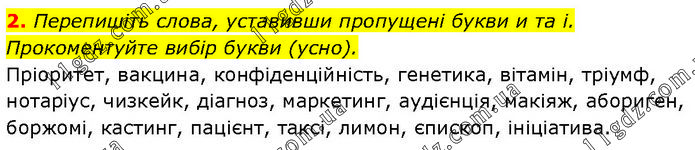 Перепишіть слова, уставивши пропущені букви и та і. Прокоментуйте вибір букви (усно). Пріоритет, вакцина, конфіденційність, генетика, вітамін, тріумф, нотаріус, чизкейк, діагноз, маркетинг, аудієнція, макіяж, абориген, боржомі, кастинг, пацієнт, таксі, лимон, єпископ, ініціатива.