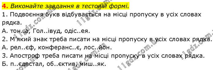 Виконайте завдання в тестовій формі. 1. Подвоєння букв відбувається на місці пропуску в усіх словах рядка. А. тон..а, Гол..івуд, одіс..ея. 2. М’який знак треба писати на місці пропуску в усіх словах рядка. А. рел..єф, конферанс..є, лос..йон. 3. Апостроф треба писати на місці пропуску в усіх словах рядка. Б. п..єдестал, об..єктив, миш..як.