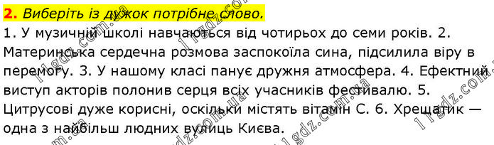 Виберіть із дужок потрібне слово. 1. У музичній школі навчаються від чотирьох до семи років. 2. Материнська сердечна розмова заспокоїла сина, підсилила віру в перемогу. 3. У нашому класі панує дружня атмосфера. 4. Ефектний виступ акторів полонив серця всіх учасників фестивалю. 5. Цитрусові дуже корисні, оскільки містять вітамін С. 6. Хрещатик — одна з найбільш людних вулиць Києва.