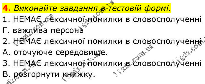 Виконайте завдання в тестовій формі. 1. НЕМАЄ лексичної помилки в словосполученні Г. важлива персона 2. НЕМАЄ лексичної помилки в словосполученні А. оточуюче середовище. 3. НЕМАЄ лексичної помилки в словосполученні В. розгорнути книжку.