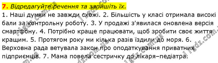 Відредагуйте речення та запишіть їх. 1. Наші думки не завжди схожі. 2. Більшість у класі отримала високі бали за контрольну роботу. 3. У продажі з'явилася оновлена версія смартфону. 4. Потрібно краще працювати, щоб зробити своє життя кращим. 5. Протягом року ми кілька разів їздили до моря. 6. Верховна рада ветувала закон про оподаткування приватних підприємців. 7. Мама повела сестричку до лікаря–педіатра.