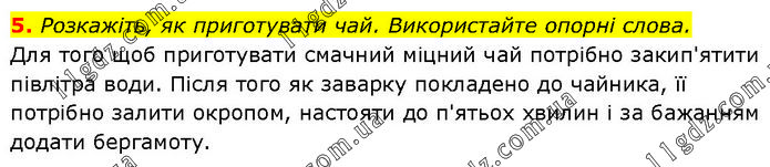 Розкажіть, як приготувати чай. Використайте опорні слова. Для того щоб приготувати смачний міцний чай потрібно закип'ятити півлітра води. Після того як заварку покладено до чайника, її потрібно залити окропом, настояти до п'ятьох хвилин і за бажанням додати бергамоту.