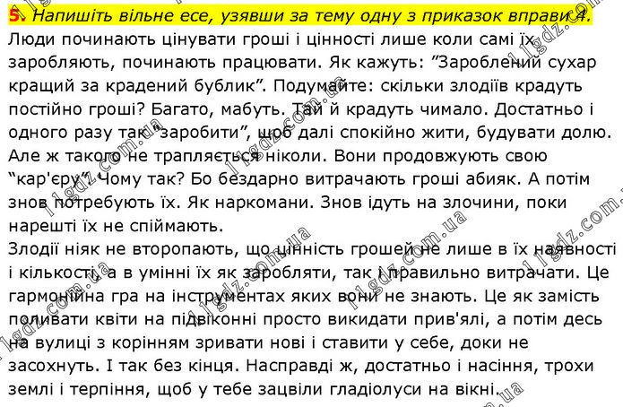 Напишіть вільне есе, узявши за тему одну з приказок вправи 4. Люди починають цінувати гроші і цінності лише коли самі їх заробляють, починають працювати. Як кажуть: ”Зароблений сухар кращий за крадений бублик”. Подумайте: скільки злодіїв крадуть постійно гроші? Багато, мабуть. Тай й крадуть чимало. Достатньо і одного разу так “заробити”, щоб далі спокійно жити, будувати долю. Але ж такого не трапляється ніколи. Вони продовжують свою “кар'єру”. Чому так? Бо бездарно витрачають гроші абияк. А потім знов потребують їх. Як наркомани. Знов ідуть на злочини, поки нарешті їх не спіймають. Злодії ніяк не второпають, що цінність грошей не лише в їх наявності і кількості, а в умінні їх як заробляти, так і правильно витрачати. Це гармонійна гра на інструментах яких вони не знають. Це як замість поливати квіти на підвіконні просто викидати прив'ялі, а потім десь на вулиці з корінням зривати нові і ставити у себе, доки не засохнуть. І так без кінця. Насправді ж, достатньо і насіння, трохи землі і терпіння, щоб у тебе зацвіли гладіолуси на вікні.