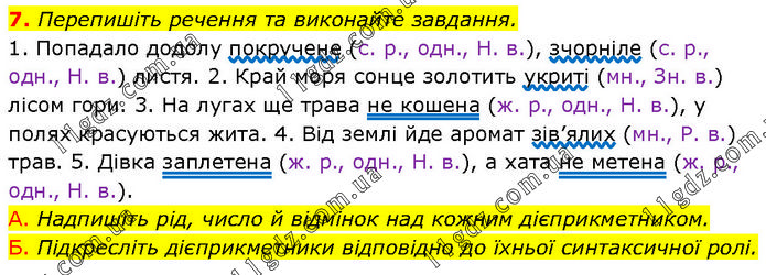 Перепишіть речення та виконайте завдання. 1. Попадало додолу покручене (с. р., одн., Н. в.), зчорніле (с. р., одн., Н. в.) листя. 2. Край моря сонце золотить укриті (мн., Зн. в.) лісом гори. 3. На лугах ще трава не кошена (ж. р., одн., Н. в.), у полях красуються жита. 4. Від землі йде аромат зів’ялих (мн., Р. в.) трав. 5. Дівка заплетена (ж. р., одн., Н. в.), а хата не метена (ж. р., одн., Н. в.). А. Надпишіть рід, число й відмінок над кожним дієприкметником. Б. Підкресліть дієприкметники відповідно до їхньої синтаксичної ролі.