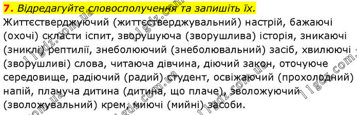 Відредагуйте словосполучення та запишіть їх. Життєстверджуючий (життєстверджувальний) настрій, бажаючі (охочі) скласти іспит, зворушуюча (зворушлива) історія, зникаючі (зниклі) рептилії, знеболюючий (знеболювальний) засіб, хвилюючі (зворушливі) слова, читаюча дівчина, діючий закон, оточуюче середовище, радіючий (радий) студент, освіжаючий (прохолодний) напій, плачуча дитина (дитина, що плаче), зволожуючий (зволожувальний) крем, миючі (мийні) засоби.