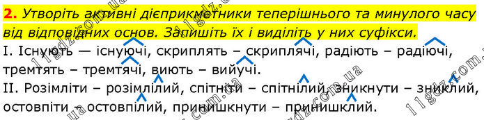 Утворіть активні дієприкметники теперішнього та минулого часу від відповідних основ. Запишіть їх і виділіть у них суфікси. I. Існують — існуючі, скриплять – скриплячі, радіють – радіючі, тремтять – тремтячі, виють – вийучі. II. Розімліти – розімлілий, спітніти – спітнілий, зникнути – зниклий, остовпіти – остовпілий, принишкнути – принишклий.