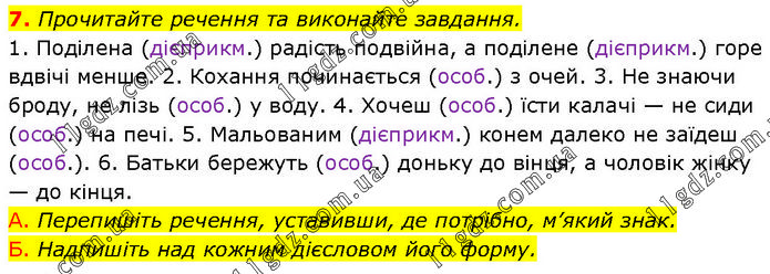 Прочитайте речення та виконайте завдання. 1. Поділена (дієприкм.) радість подвійна, а поділене (дієприкм.) горе вдвічі менше. 2. Кохання починається (особ.) з очей. 3. Не знаючи броду, не лізь (особ.) у воду. 4. Хочеш (особ.) їсти калачі — не сиди (особ.) на печі. 5. Мальованим (дієприкм.) конем далеко не заїдеш (особ.). 6. Батьки бережуть (особ.) доньку до вінця, а чоловік жінку — до кінця. А. Перепишіть речення, уставивши, де потрібно, м’який знак. Б. Надпишіть над кожним дієсловом його форму.