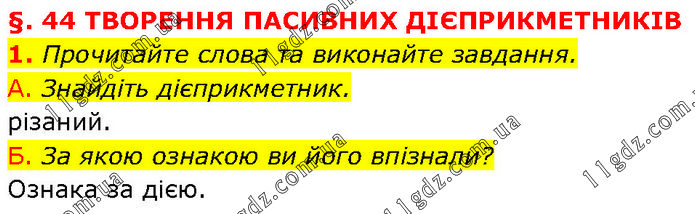 §. 44 ТВОРЕННЯ ПАСИВНИХ ДІЄПРИКМЕТНИКІВ 1. Прочитайте слова та виконайте завдання. А. Знайдіть дієприкметник. різаний. Б. За якою ознакою ви його впізнали? Ознака за дією.
