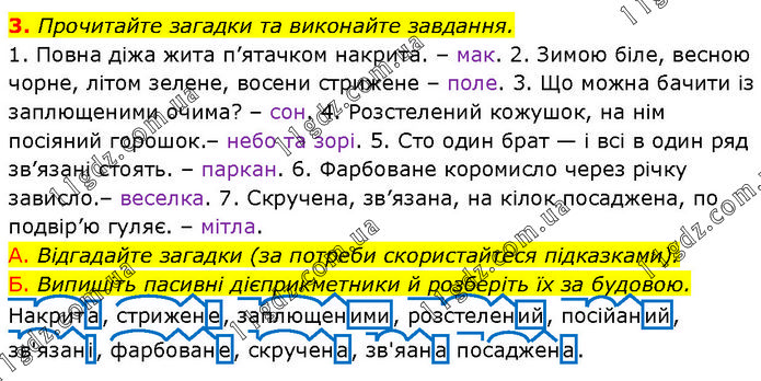 Прочитайте загадки та виконайте завдання. 1. Повна діжа жита п’ятачком накрита. – мак. 2. Зимою біле, весною чорне, літом зелене, восени стрижене – поле. 3. Що можна бачити із заплющеними очима? – сон. 4. Розстелений кожушок, на нім посіяний горошок.– небо та зорі. 5. Сто один брат — і всі в один ряд зв’язані стоять. – паркан. 6. Фарбоване коромисло через річку зависло.– веселка. 7. Скручена, зв’язана, на кілок посаджена, по подвір’ю гуляє. – мітла. А. Відгадайте загадки (за потреби скористайтеся підказками). Б. Випишіть пасивні дієприкметники й розберіть їх за будовою. Накрита, стрижене, заплющеними, розстелений, посійаний, зв'язані, фарбоване, скручена, зв'яана посаджена.