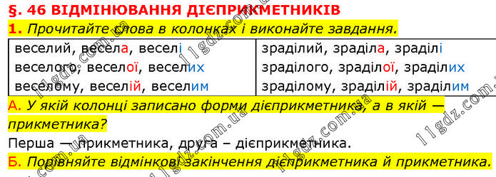 §. 46 ВІДМІНЮВАННЯ ДІЄПРИКМЕТНИКІВ 1. Прочитайте слова в колонках і виконайте завдання. веселий, весела, веселі веселого, веселої, веселих веселому, веселій, веселим зраділий, зраділа, зраділі зраділого, зраділої, зраділих зраділому, зраділій, зраділим А. У якій колонці записано форми дієприкметника, а в якій — прикметника? Перша — прикметника, друга – дієприкметника. Б. Порівняйте відмінкові закінчення дієприкметника й прикметника.