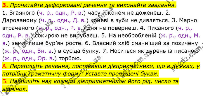 Прочитайте деформовані речення та виконайте завдання. 1. Згаяного (ч. р., одн., Р. в.) часу й конем не доженеш. 2. Дарованому (ч. р., одн., Д. в.) коневі в зуби не дивляться. 3. Марно втраченого (ч. р., одн., Р. в.) дня не повернеш. 4. Писаного (ч. р., одн., Р. в.) сокирою не вирубаєш. 5. На необробленій (ж. р., одн., М. в.) землі лише бур’ян росте. 6. Власний хліб смачніший за позичену (ж. р., одн., Зн. в.) в сусіда булку. 7. Носиться як дурень із писаною (ж. р., одн., Ор. в.) торбою. А. Перепишіть речення, поставивши дієприкметники, що в дужках, у потрібну граматичну форму. Уставте пропущені букви. Б. Надпишіть над кожним дієприкметником його рід, число та відмінок.