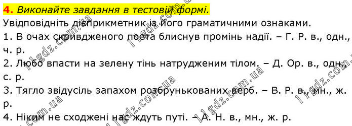 Виконайте завдання в тестовій формі. Увідповідніть дієприкметник із його граматичними ознаками. 1. В очах скривдженого поета блиснув промінь надії. – Г. Р. в., одн., ч. р. 2. Любо впасти на зелену тінь натрудженим тілом. – Д. Ор. в., одн., с. р. 3. Тягло звідусіль запахом розбрунькованих верб. – В. Р. в., мн., ж. р. 4. Ніким не сходжені нас ждуть путі. – А. Н. в., мн., ж. р.