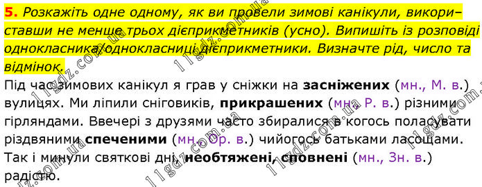 Розкажіть одне одному, як ви провели зимові канікули, викори– ставши не менше трьох дієприкметників (усно). Випишіть із розповіді однокласника/однокласниці дієприкметники. Визначте рід, число та відмінок. Під час зимових канікул я грав у сніжки на засніжених (мн., М. в.) вулицях. Ми ліпили сніговиків, прикрашених (мн., Р. в.) різними гірляндами. Ввечері з друзями часто збиралися в когось поласувати різдвяними спеченими (мн., Ор. в.) чийогось батьками ласощами. Так і минули святкові дні, необтяжені, сповнені (мн., Зн. в.) радістю.