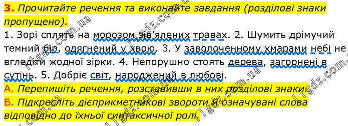 Прочитайте речення та виконайте завдання (розділові знаки пропущено). 1. Зорі сплять на морозом зів’ялених травах. 2. Шумить дрімучий темний бір, одягнений у хвою. 3. У заволоченному хмарами небі не вгледіти жодної зірки. 4. Непорушно стоять дерева, загорнені в сутінь. 5. Добріє світ, народжений в любові. А. Перепишіть речення, розставивши в них розділові знаки. Б. Підкресліть дієприкметникові звороти й означувані слова відповідно до їхньої синтаксичної ролі.