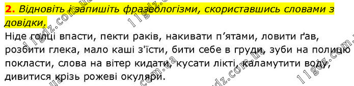 Відновіть і запишіть фразеологізми, скориставшись словами з довідки. Ніде голці впасти, пекти раків, накивати п’ятами, ловити ґав, розбити глека, мало каші з'їсти, бити себе в груди, зуби на полицю покласти, слова на вітер кидати, кусати лікті, каламутити воду, дивитися крізь рожеві окуляри.
