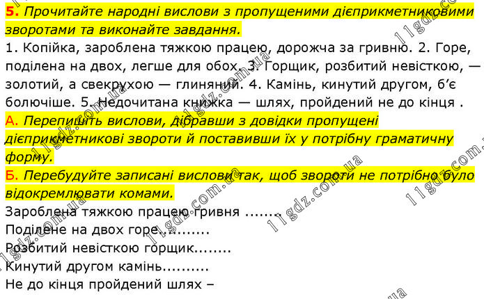 Прочитайте народні вислови з пропущеними дієприкметниковими зворотами та виконайте завдання. 1. Копійка, зароблена тяжкою працею, дорожча за гривню. 2. Горе, поділена на двох, легше для обох. 3. Горщик, розбитий невісткою, — золотий, а свекрухою — глиняний. 4. Камінь, кинутий другом, б’є болючіше. 5. Недочитана книжка — шлях, пройдений не до кінця . А. Перепишіть вислови, дібравши з довідки пропущені дієприкметникові звороти й поставивши їх у потрібну граматичну форму. Б. Перебудуйте записані вислови так, щоб звороти не потрібно було відокремлювати комами. Зароблена тяжкою працею гривня ........ Поділене на двох горе........... Розбитий невісткою горщик........ Кинутий другом камінь.......... Не до кінця пройдений шлях –