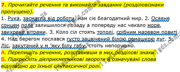 Прочитайте речення та виконайте завдання (розділовізнаки пропущено). 1. Рука, засмагла від роботи, нам сіє благодатний мир. 2. Осяяне сонцем поле залишилося позаду а попереду нас чекало море, звихрене вітрами. 3. Коло сіл стоять тополі, срібним маревом повиті. 4. Над берегом послався густо зацвічений білою ромашкою луг. 5. Ліс, закутаний у м ’яку білу габу, стоїть непорушно. А. Перепишіть речення, розставивши в них розділові знаки. Б. Підкресліть дієприкметникові звороти й означувані слова відповідно до їхньої синтаксичної ролі.