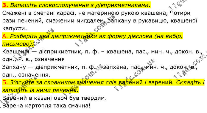 Випишіть словосполучення з дієприкметниками. Смажені в сметані карасі, не материною рукою квашена, Чотири рази печений, смаженим мигдалем, запхану в рукавицю, квашеної капусти. А. Розберіть два дієприкметники як форму дієслова (на вибір, письмово). Квашеної — дієприкметник, п. ф. – квашена, пас., мин. ч., докон. в., одн., Р. в., означення Запхану — дієприкметник, п. ф. – запхана, пас., мин. ч., докон. в., одн., означення. Б. З’ясуйте за словником значення слів варений і варений. Складіть і запишіть із ними речення. Варений в казані овоч був твердим. Варена картопля така смачна!