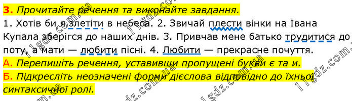 Прочитайте речення та виконайте завдання. 1. Хотів би я злетіти в небеса. 2. Звичай плести вінки на Івана Купала зберігся до наших днів. 3. Привчав мене батько трудитися до поту, а мати — любити пісні. 4. Любити — прекрасне почуття. А. Перепишіть речення, уставивши пропущені букви є та и. Б. Підкресліть неозначені форми дієслова відповідно до їхньої синтаксичної ролі.