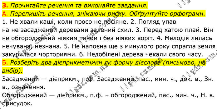 Прочитайте речення та виконайте завдання. А. Перепишіть речення, знімаючи риску. Обґрунтуйте орфограми. 1. Не хвали каші, коли просо не посіяне. 2. Погляд упав на не засаджений деревами зелений схил. 3. Перед хатою плай. Він не обгороджений ніяким тином і без ніяких воріт. 4. Мелодія лилась нечувана, незнана. 5. Не напоєна ще з минулого року спрагла земля закурилася чорториями. 6. Недобілені дерева чекали свого часу. Б. Розберіть два дієприкметники як форму дієслова (письмово, на вибір). Засаджений — дієприкм., п.ф. Засаджений, пас., мин. ч., док. в., Зн. в., означення. Обгороджений — дієприкм., п.ф. – обгороджений, пас., мин. ч., Н. в. присудок.