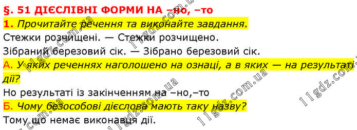 §. 51 ДІЄСЛІВНІ ФОРМИ НА –но, –то 1. Прочитайте речення та виконайте завдання. Стежки розчищені. — Стежки розчищено. Зібраний березовий сік. — Зібрано березовий сік. А. У яких реченнях наголошено на ознаці, а в яких — на результаті дії? Но результаті із закінченням на –но,–то Б. Чому безособові дієслова мають таку назву? Тому що немає виконавця дії.