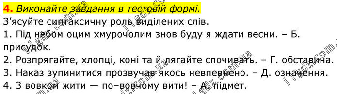 Виконайте завдання в тестовій формі. З’ясуйте синтаксичну роль виділених слів. 1. Під небом оцим хмурочолим знов буду я ждати весни. – Б. присудок. 2. Розпрягайте, хлопці, коні та й лягайте спочивать. – Г. обставина. 3. Наказ зупинитися прозвучав якось невпевнено. – Д. означення. 4. 3 вовком жити — по–вовчому вити! – А. підмет.
