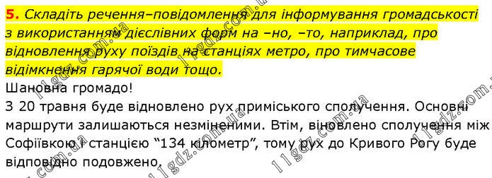 Складіть речення–повідомлення для інформування громадськості з використанням дієслівних форм на –но, –то, наприклад, про відновлення руху поїздів на станціях метро, про тимчасове відімкнення гарячої води тощо. Шановна громадо! З 20 травня буде відновлено рух приміського сполучення. Основні маршрути залишаються незміненими. Втім, віновлено сполучення між Софіївкою і станцією “134 кілометр”, тому рух до Кривого Рогу буде відповідно подовжено.