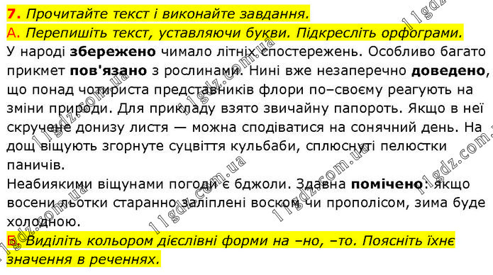 Прочитайте текст і виконайте завдання. А. Перепишіть текст, уставляючи букви. Підкресліть орфограми. У народі збережено чимало літніх спостережень. Особливо багато прикмет пов'язано з рослинами. Нині вже незаперечно доведено, що понад чотириста представників флори по–своєму реагують на зміни природи. Для прикладу взято звичайну папороть. Якщо в неї скручене донизу листя — можна сподіватися на сонячний день. На дощ віщують згорнуте суцвіття кульбаби, сплюснуті пелюстки паничів. Неабиякими віщунами погоди є бджоли. Здавна помічено: якщо восени льотки старанно заліплені воском чи прополісом, зима буде холодною. Б. Виділіть кольором дієслівні форми на –но, –то. Поясніть їхнє значення в реченнях.