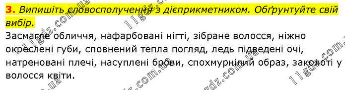 3. Випишіть словосполучення з дієприкметником. Обґрунтуйте свій вибір. Засмагле обличчя, нафарбовані нігті, зібране волосся, ніжно окреслені губи, сповнений тепла погляд, ледь підведені очі, натреновані плечі, насуплені брови, спохмурнілий образ, заколоті у волосся квіти.