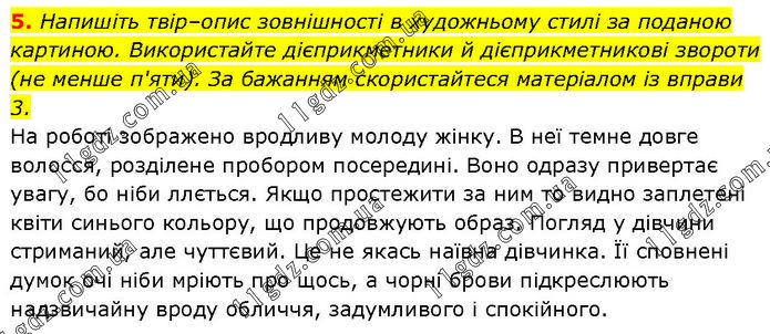 Напишіть твір–опис зовнішності в художньому стилі за поданою картиною. Використайте дієприкметники й дієприкметникові звороти (не менше п'яти). За бажанням скористайтеся матеріалом із вправи 3. На роботі зображено вродливу молоду жінку. В неї темне довге волосся, розділене пробором посередині. Воно одразу привертає увагу, бо ніби ллється. Якщо простежити за ним то видно заплетені квіти синього кольору, що продовжують образ. Погляд у дівчини стриманий, але чуттєвий. Це не якась наївна дівчинка. Її сповнені думок очі ніби мріють про щось, а чорні брови підкреслюють надзвичайну вроду обличчя, задумливого і спокійного.