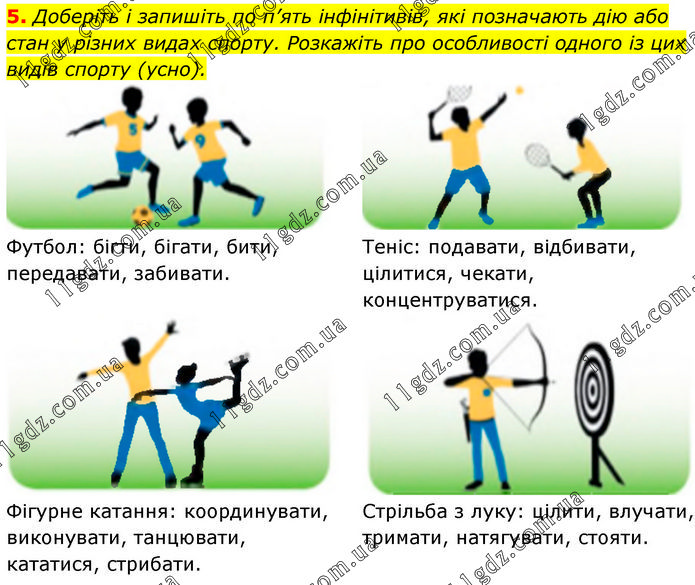 Доберіть і запишіть по п’ять інфінітивів, які позначають дію або стан у різних видах спорту. Розкажіть про особливості одного із цих видів спорту (усно).