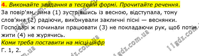 4. Виконайте завдання в тестовій формі. Прочитайте речення. За повір'ям, зима (1) зустрівшись із весною, відступала, тому слов’яни (2) радіючи, виконували закличні пісні — веснянки. Господарі ж починали працювати (3) не покладаючи рук, щоб потім жити (4) не журячись. Коми треба поставити на місці цифр Г. 1, 2.