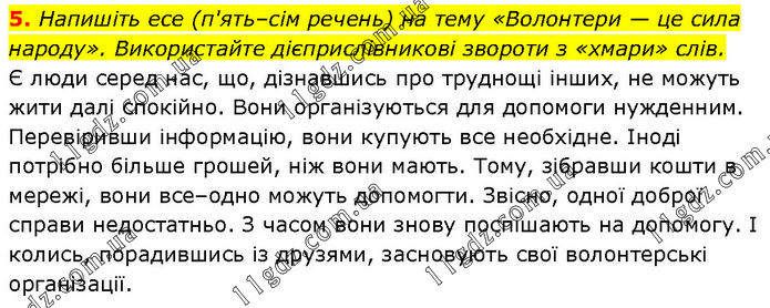 Напишіть есе (п'ять–сім речень) на тему «Волонтери — це сила народу». Використайте дієприслівникові звороти з «хмари» слів. Є люди серед нас, що, дізнавшись про труднощі інших, не можуть жити далі спокійно. Вони організуються для допомоги нужденним. Перевіривши інформацію, вони купують все необхідне. Іноді потрібно більше грошей, ніж вони мають. Тому, зібравши кошти в мережі, вони все–одно можуть допомогти. Звісно, одної доброї справи недостатньо. З часом вони знову поспішають на допомогу. І колись, порадившись із друзями, засновують свої волонтерські організації.