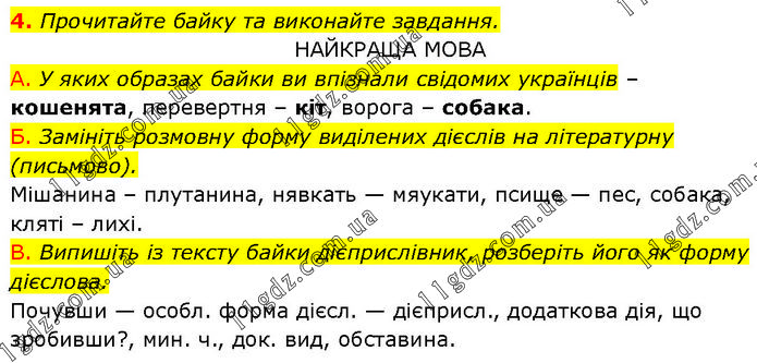 Прочитайте байку та виконайте завдання. НАЙКРАЩА МОВА А. У яких образах байки ви впізнали свідомих українців – кошенята, перевертня – кіт, ворога – собака. Б. Замініть розмовну форму виділених дієслів на літературну (письмово). Мішанина – плутанина, нявкать — мяукати, псище — пес, собака, кляті – лихі. В. Випишіть із тексту байки дієприслівник, розберіть його як форму дієслова. Почувши — особл. форма дієсл. — дієприсл., додаткова дія, що зробивши?, мин. ч., док. вид, обставина.
