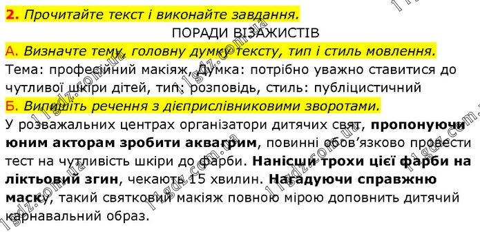 Прочитайте текст і виконайте завдання. ПОРАДИ ВІЗАЖИСТІВ А. Визначте тему, головну думку тексту, тип і стиль мовлення. Тема: професійний макіяж, Думка: потрібно уважно ставитися до чутливої шкіри дітей, тип: розповідь, стиль: публіцистичний Б. Випишіть речення з дієприслівниковими зворотами. У розважальних центрах організатори дитячих свят, пропонуючи юним акторам зробити аквагрим, повинні обов’язково провести тест на чутливість шкіри до фарби. Нанісши трохи цієї фарби на ліктьовий згин, чекають 15 хвилин. Нагадуючи справжню маску, такий святковий макіяж повною мірою доповнить дитячий карнавальний образ.