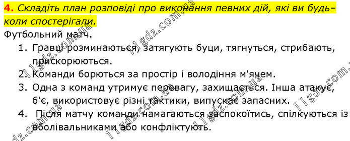 Складіть план розповіді про виконання певних дій, які ви будь–коли спостерігали. Футбольний матч. 1. Гравці розминаються, затягують буци, тягнуться, стрибають, прискорюються. 2. Команди борються за простір і володіння м'ячем. 3. Одна з команд утримує перевагу, захищається. Інша атакує, б'є, використовує різні тактики, випускає запасних. 4. Після матчу команди намагаються заспокоїтись, спілкуються із вболівальниками або конфліктують.