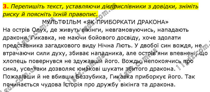 Перепишіть текст, уставляючи дієприслівники з довідки, зніміть риску й поясніть їхній правопис. МУЛЬТФІЛЬМ «ЯК ПРИБОРКАТИ ДРАКОНА» На острів Олух, де живуть вікінги, невгамовуючись, нападають дракони. Гикавка, не маючи бойового досвіду, хоче здолати представника загадкового виду Нічна Лють. У двобої син вождя, не втрачаючи сили духу, збиває нападника, але острів’яни впевнені, що хлопець повернувся не здужавши його. Вождь, непокоячись про сина, усе–таки дозволяє юнакові шукати збитого дракона. Пожалівши й не вбивши Беззубика, Гикавка приборкує його. Так починається чудова історія про дружбу вікінга та дракона.