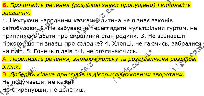 Прочитайте речення (розділові знаки пропущено) і виконайте завдання. 1. Нехтуючи народними казками, дитина не пізнає законів світобудови. 2. Не забуваючи переглядати мультфільми гуртом, не припиняємо дбати про емоційний стан родини. 3. Не зазнавши гіркого, що ти знаєш про солодке? 4. Хлопці, не гаючись, забралися на пліт. 5. Гонець підвів очі, не розгинаючись. A. Перепишіть речення, знімаючи риску та розставляючи розділові знаки. B. Доберіть кілька прислів’їв із дієприслівниковими зворотами. Не подумавши, не кажи! Не стирбнувши, не долетиш.